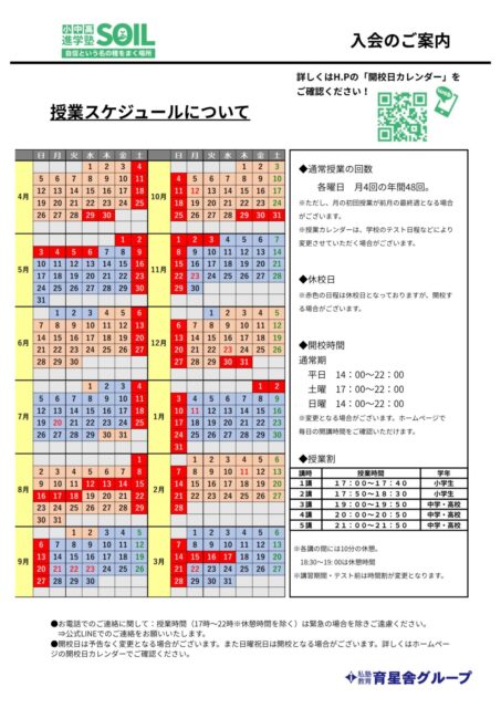 - 進学塾SOILでは小学4年生を除き、集団授業・個別コースの選択に関して学力テストを実施します。集団クラスの基準に満たない場合は個別コースでご入塾いただきます。